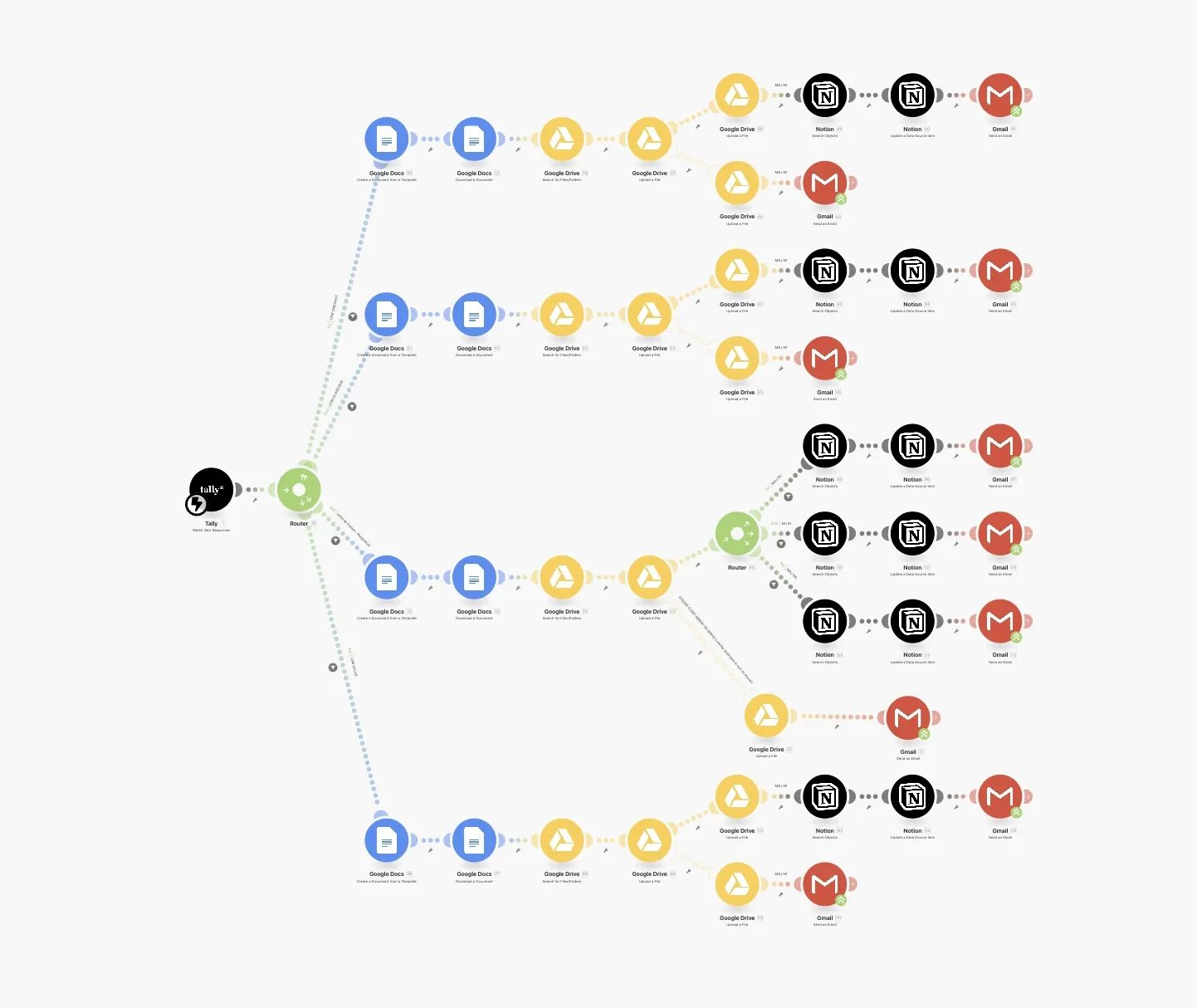 Je ne le recommande pas, mais j'ai déjà créé des workflows gérant tout le parcours client d'une startup. Inscription, facturation, onboarding, support en un seul scénario. Sur Zapier ca aurait été impossible.